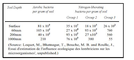 Reference to the table shows that at a soil depth of 60 millimeters, there are an incredible 27,012,770 bacteria per gram of soil. In addition are three groups of nitrogen-liberating bacteria, They arc grouped separately because they work in three different, but complementary ways.