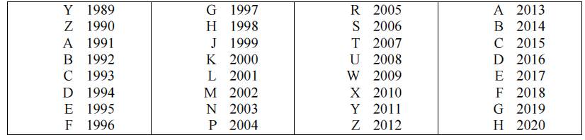 Letters that could be difficult to read or misinterpreted as a number are not used for year letters (i.e. ‘I’, ‘O’,‘Q’, and ‘V’ are not used)