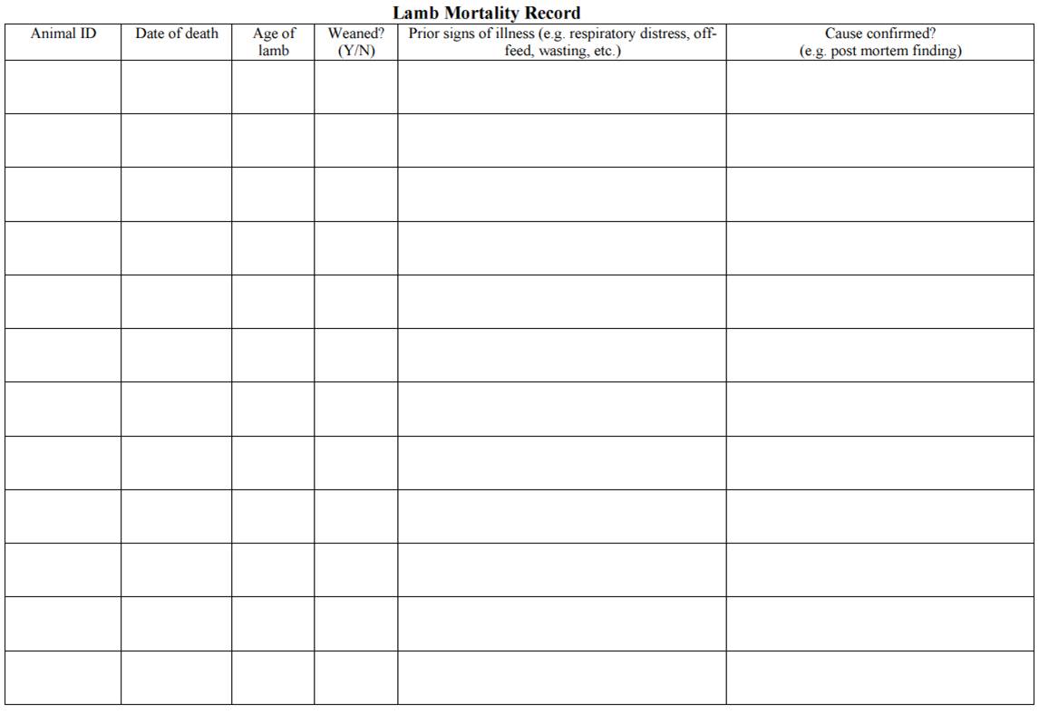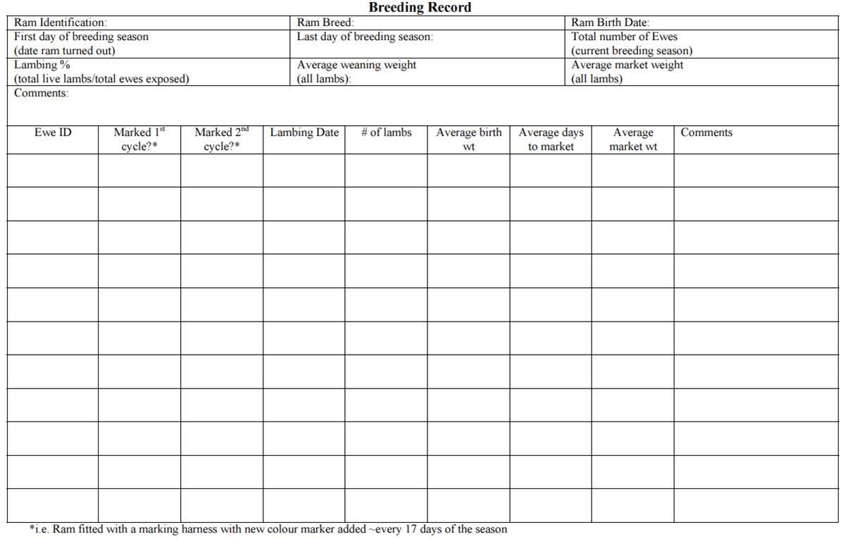 Maintaining performance records for your flock is one of the best management tools you can use to increase the efficiency of your operation. Such factors as ram performance, weaning weights, lambing percentage, and death losses have a direct effect on the income and profitability of your flock. All producers should try to maintain some form of record keeping system. A very simple form of record keeping is to keep track of the number of ewes exposed to ram(s), the number of lambs born from those ewes, and the number of lambs weaned. Monitoring even these very basic statistics will give a producer an idea of flock productivity. Producers interested in making serious gains in productivity, however, will want to develop a record keeping system to track the performance of individual animals. Maintaining records helps producers pinpoint areas of weakness in the overall flock performance, which will help when making decisions about flock management, the selection of new breeding stock and culling low performing animals. There are extensive computer management programs, such as Ewebyte, that are designed for use on sheep farms.