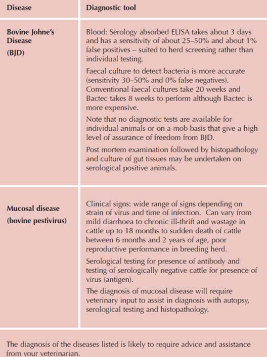 Diagnostic tools to assess disease status for beef cattleDiagnostic tools to assess the Bovine Johne’s Disease (BJD) and Mucosal disease (Bovine Pestivirus) status of introduced cattle.