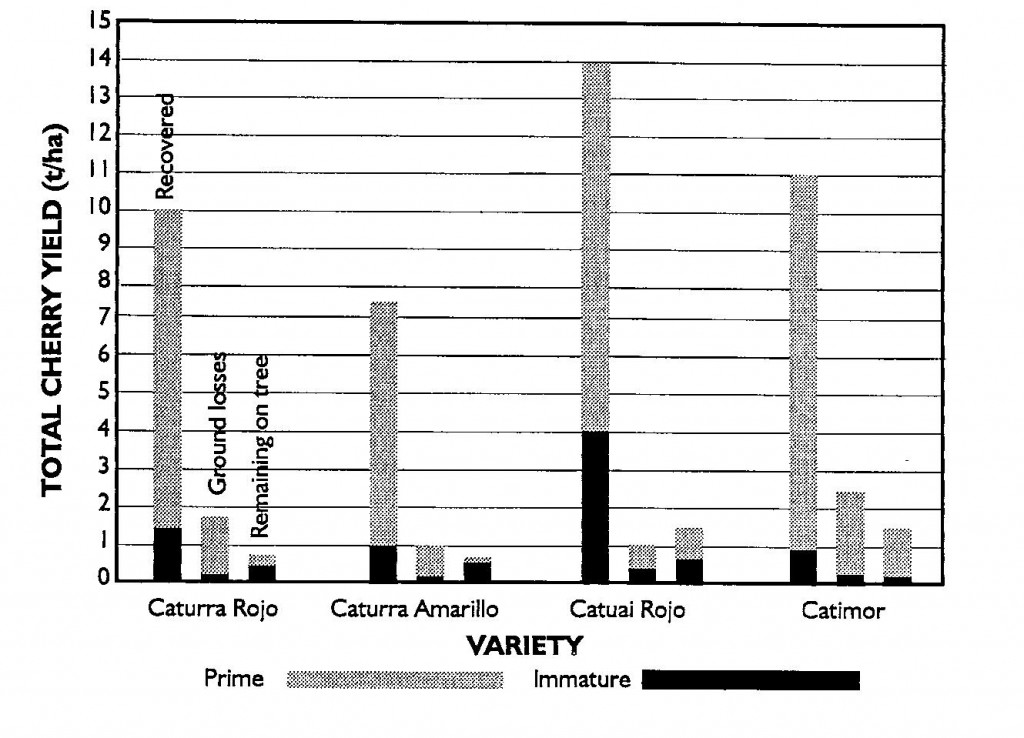 The data illustrates the high levels of cherry removal possible when maximum selectivity is sacrificed for high cherry removal and harvesting rates. Typically, less than 5% of cherry remained on the trees of the very mature cultivars. These losses increased up to 10% in the cultivars with a greater proportion of immature cherry.