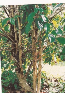 Losses of cherry to the ground in these trials were consistent with commercial experience, and were typically below 8% of total cherry removed by the shakers. If the cherry collecting system cannot operate properly because of multiple stems (see photo right) or other obstructions, losses can be higher as shown in data for cultivar Catimor. At higher ground speeds, the percentage of cherry lost to the ground through the catching system often increases.