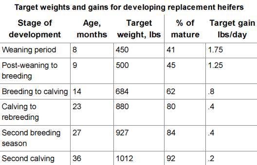 The heifers attain enough gain to attain puberty but also avoid getting them too fat. Rates of gain not lower than 1 lb. or greater than 2.O lbs. per day reflect the needs of most of our current cattle population. For example, a heifer weighs 450 lbs. at weaning and has a target puberty weight of 675 lbs. There are 200 days between weaning and breeding. We would actually prefer her to reach puberty weight at least 2 to 3 cycles before breeding (160 days).