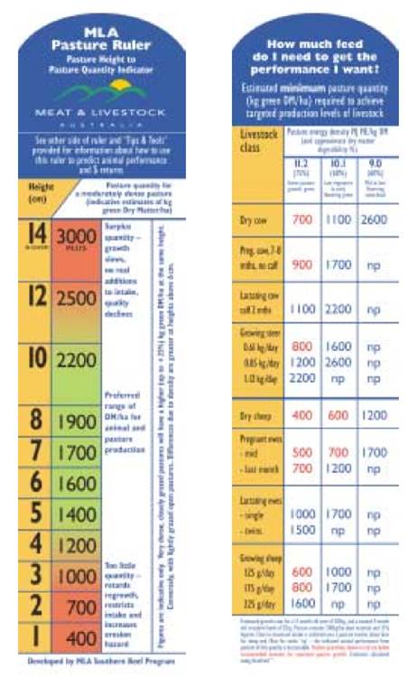 • Pasture rulers or sticks that measure height and equate to pasture mass – calibrated to read green dry matter when 100% green, and capable of conversion to dry matter, using PROGRAZE information. These aids are simple to use and very cheap.