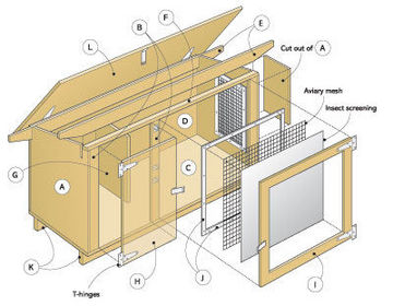 PVA and construction adhesive; 6 x 150mm T-hinges or gate hinges; 2 x 75mm strap hinges; aviary mesh (600 x 520mm and 400 x 300mm); aluminium insect screening (600 x 520mm and 400 x 300mm); 3 small hasp and staple latches for doors; 1 long hasp and stable latch for lid; 4 small padlocks (common keyed); Paint - Delux Lady Fern; Cabot’s Crystal Clear.