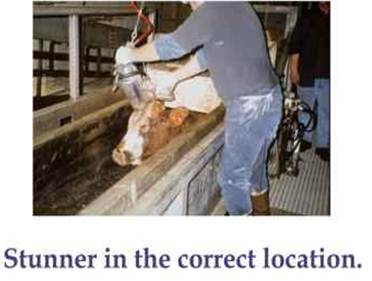 For large bulls and other heavy livestock such as bison, some plants routinely shoot them twice with a captive bolt. To verify that 95% or more are rendered insensible with one shot, the auditor or inspector should check for signs of return to sensibility BEFORE the second shot is done. A stunner shot that shoots in the air and does not touch the animal does not count. If the bolt of the stunner touches or partially penetrates the animal it is counted as a missed shot.