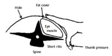 The score can be varied half a score depending upon the amount of tail head fat, for example if the short rib palpation (using the thumb) gives score 4 but the tail head is a typical 3, the score would then be 3.5. Scores can be directly related to fatness at the P8 site.