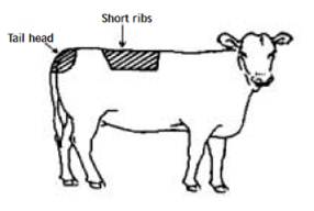 The degree of fat cover around the tail head is assessed by using the fingers and thumb and should be done at the same time as assessing the short ribs. The appropriate score is given depending on the degree to which palpable fat can be felt.