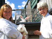 Dr Sandra Eady (right) passes a Crusader rabbit to Ms Kathleen Bowerman of the Snowy Mountains Gourmet Rabbit Company