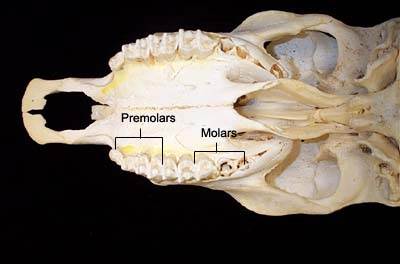 Ruminants such as cattle, sheep and goats are herbivores with a unique digestive anatomy. A prominent feature of ruminant dental anatomy is that they lack upper incisors, having instead a “dental pad”, as shown in the image to the right of a goat.