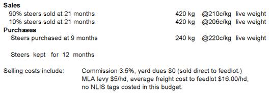 Growing out steers for feedlot market 240kg-420kg in 12 months. Enterprise unit is 100 steers purchased at 9 months of age at 240kg liveweight, held for 12 months and turned off at 400 kg liveweight direct to feedlot.