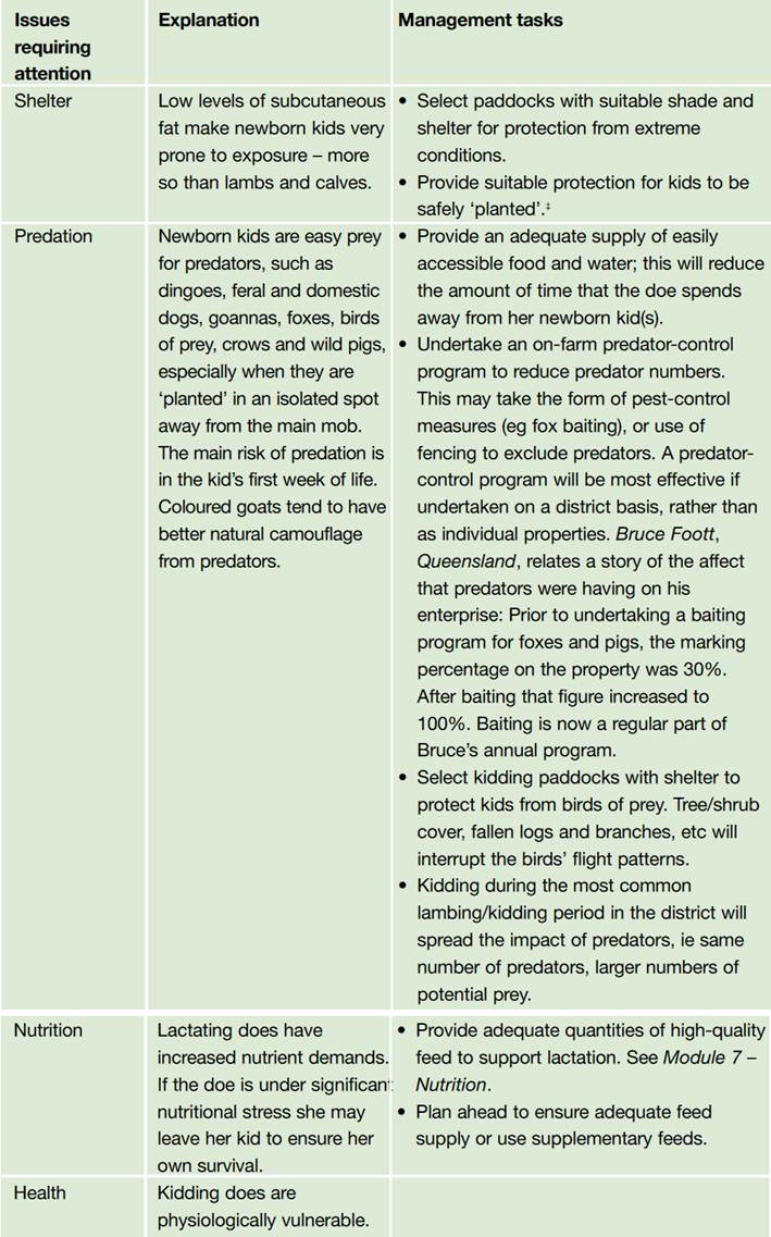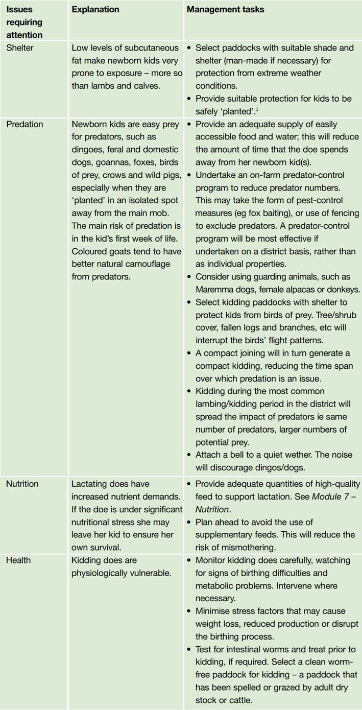 • Ensuring that husbandry activities are timed with due consideration for animal health and welfare. For example, avoid mustering heavily pregnant animals and does with newborn kids.