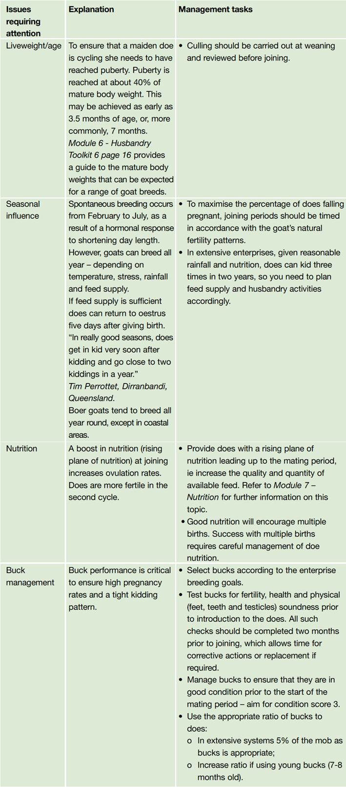 For further information to assist you in making decisions about age of first joining, time of year to join and buck management refer to the article Goat Joining Options.