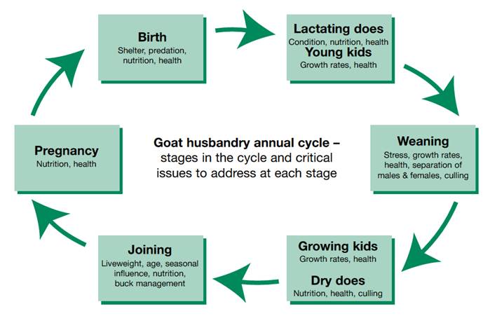The annual cycle of goat husbandry comprises six distinct phases. For each phase key issues of concern are identified, their relevance explained and an appropriate management response outlined.