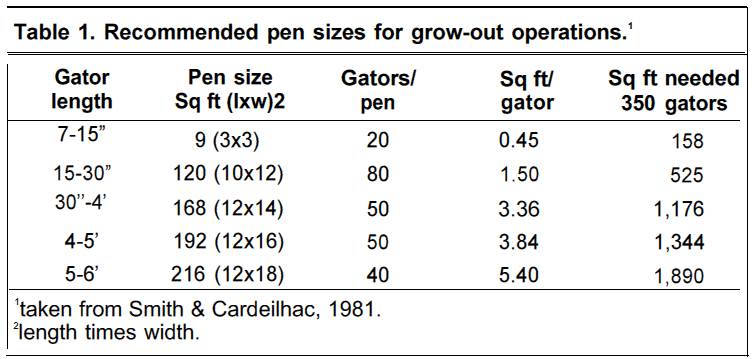 Table 1 gives examples of pen size to alligator size and corresponding densities.