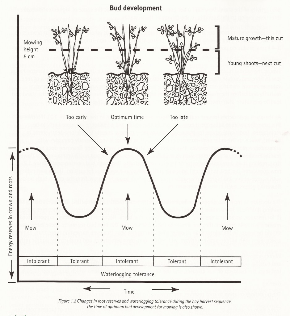 As the plant approaches harvest maturity, it stores more carbohydrate in the root. If mown at this time, the yields in subsequent cuts, its competitive ability and persistence are more likely to be maintained. Traditional advice for producing hay has been to mow at early bloom (one-tenth stems in flower), which, in the older semi-dormant cultivars such as Hunter River, generally coincides with adequately replenished root reserves. This advice is of little use in winter when flowering does not occur readily. Furthermore, other factors such as available water, pest damage and nutrition may modify flowering time, making it an unreliable indicator of true harvest maturity. Regrowth bud development (Figure 1.2) is now considered the best indicator of adequate root reserves and readiness for cutting. This is particularly so with winter-active and highly winter-active cultivars, which begin to regrow from the crown buds before flowering occurs, even in the warmer months.