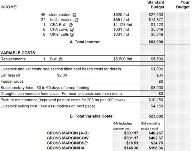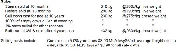 Local trade/feeders (creep fed). Enterprise unit is 100 cows weighing on average 480 kg Weaning rate: 90% (95% conception)