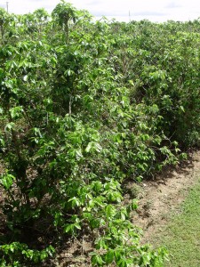 A system to ‘load’ the shaker fingers against the tree is one of the significant Australian developments in coffee harvesters. By loading the shakers against the tree, the vibration of the fingers is transferred into the tree structure more efficiently, thus removing more cherry indirectly than by direct finger contact. On larger trees, more aggressive loading is desirable than on smaller trees. Loading of the shakers is easily adjusted but usually only changed to suit major changes in harvesting conditions. Correct loading allows maximum cherry removal at the lowest possible shaker frequencies, thus reducing all types of tree damage.