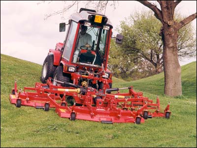 Reel mowers use a series of blades mounted in a cylindrical shape to cut grass against stationary blade. Reel mowers were the first mower design and produce a very fine cut due to the scissor action of the blades (rotary mowers tend to tear grass more than cut it). For this reason, reel mowers are frequently used on golf courses, sports fields, and other locations that need a high-quality finish on the grass. Gangs of reel mowers are pulled by tractors to cut large areas. The mowers can be ground-driven and simply towed, or they may be powered from the tractor’s PTO.