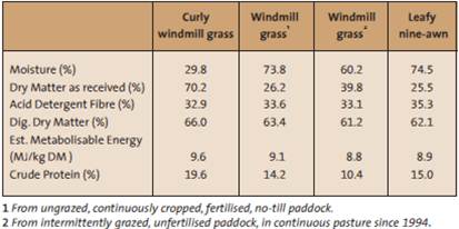The following table shows the analyses for feed quality of three species of native perennial grasses that are summer-active and growing on farms in the eastern wheatbelt. These particular grasses can be quite palatable and nutritious, depending on plant maturity and soil conditions. The samples were collected in summer when the plants were probably nutritionally at their best, that is, leafy, green, and growing vigorously.