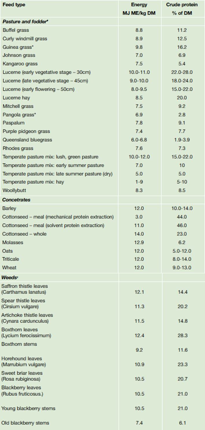 The nutritive value of plant species changes throughout the year. For example, the feed value during the vegetative stage of plant growth will be distinctly different to the reproductive (flowering) stage. Environmental conditions can also affect the nutritive value of feed eg frost. These factors need to be taken into account when assessing the value of pasture, crops, fodder and weeds as potential sources of goat feed. A feed analysis will be required to determine the exact feed quality.