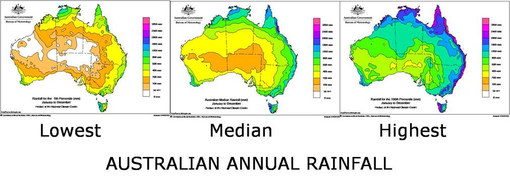 The Australian Bureau of Meteorology (BOM) produced a large wall chart a few years ago with the average annual Australian rainfalls in map form for every year between 1901 and 2000.(100 maps of Australia on one wall chart). When I studied this chart closely, over the entire twentieth century, no two years had exactly the same annual rainfall pattern for Australia. And none of them looked remotely like the Median Annual rainfall depicted in the middle of these three maps!