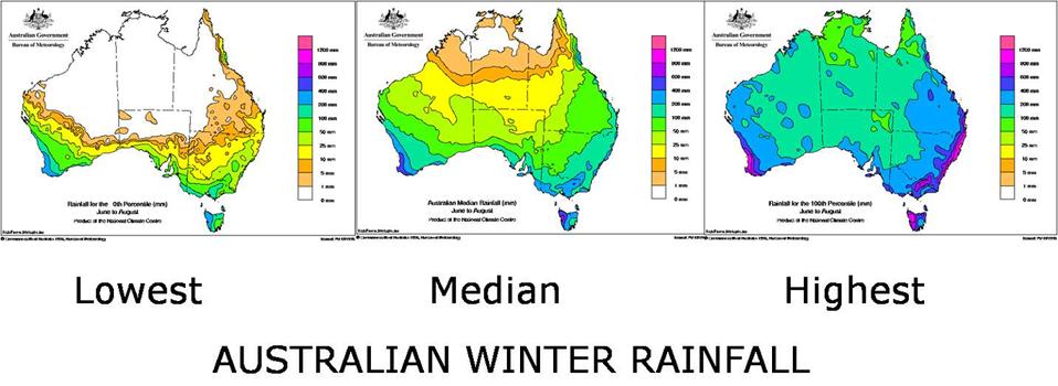 This variability clearly shows in these three maps which show the range of winter rainfall patterns across Australia.