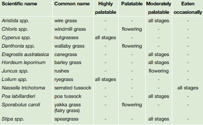 This article details the palatability of trees, shrubs, herbs, grasses and rushes to goats into four categories; highly palatable, palatable, moderately palatable and eaten occaisionally.