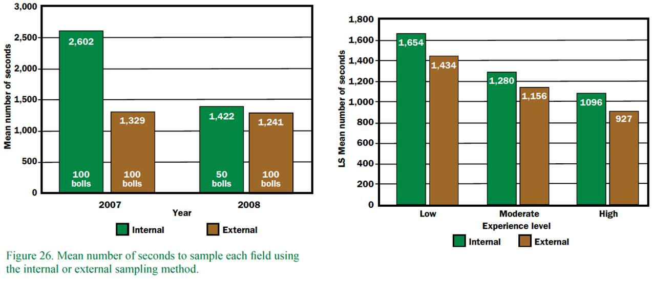 This result was expected, as experienced scouts are more comfortable moving across rows and uneven terrain while rapidly locating soft, quarter-sized bolls on plants of variable maturity. All scouts required less time when using the external sampling method compared to the internal sampling method.