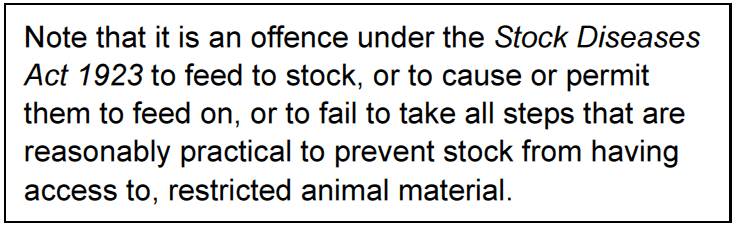 Stock such as cattle and sheep can be exposed to this meat meal by being allowed access to litter or manure containing spilled poultry feed. Such litter or manure could be within sheds, stacked for removal, stacked for composting, stacked awaiting spreading or spread on paddocks.