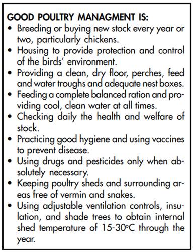 Concept: These include intensive deep litter (hens confined) or semi-intensive. The birds need protection from wind, rain, heat, cold, draughts, wild birds and foxes. A yard for ranging in good weather is needed. Consideration of the person looking after the poultry should include outside access to nest boxes and for servicing drinkers and feeders.