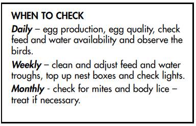 Lighting. To maximise egg production, regulate day length with supplementary light in autumn and winter. Use an automatic timer and a 60 watt bulb for each 3m2.