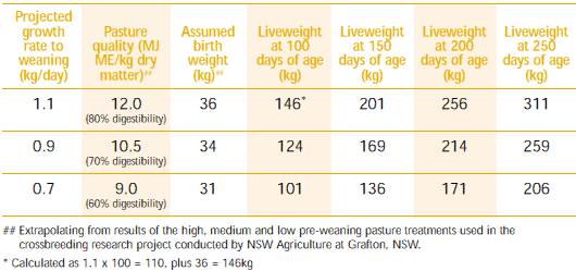 The following table shows weaning and projected live weights for three target growth rates relative to pasture quality in british breed cattle.