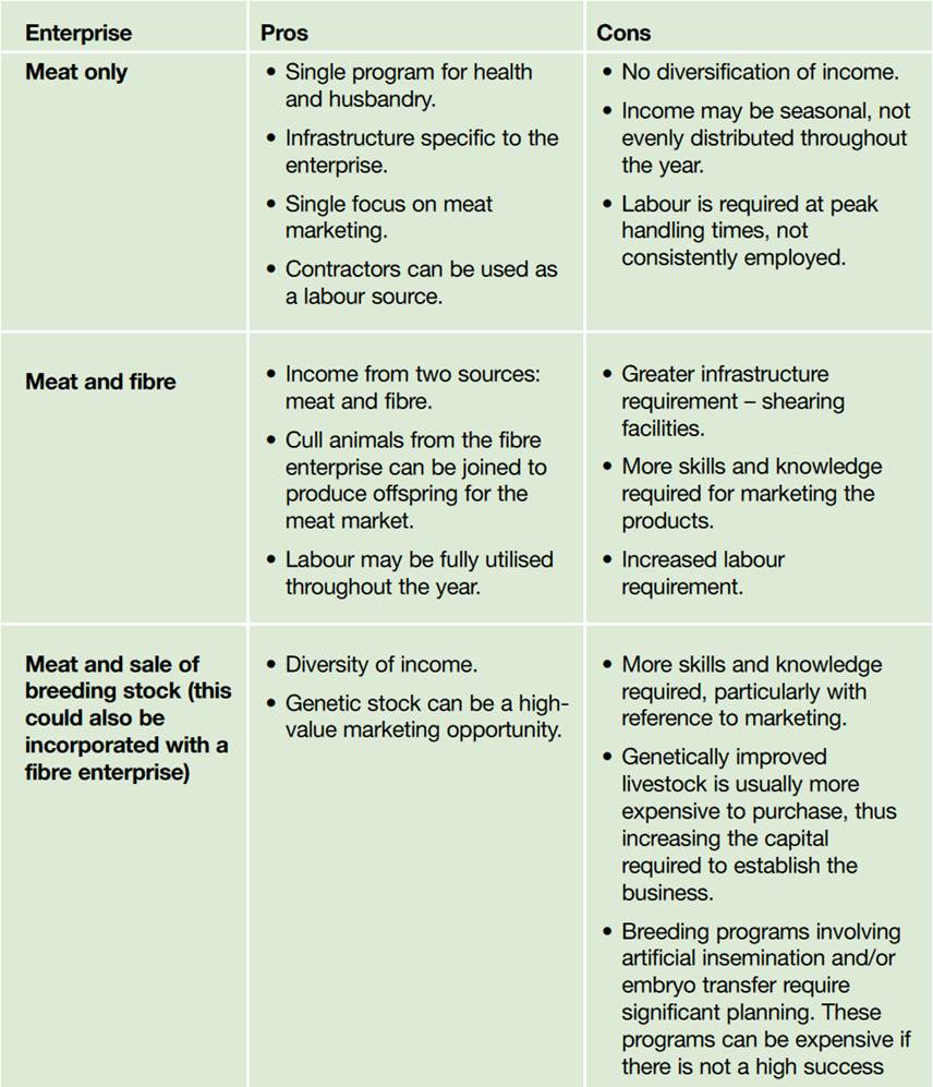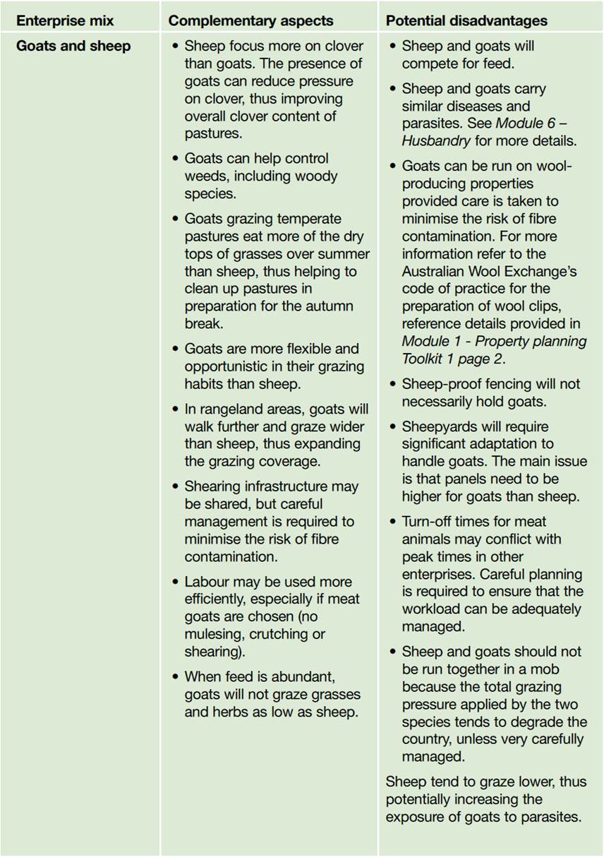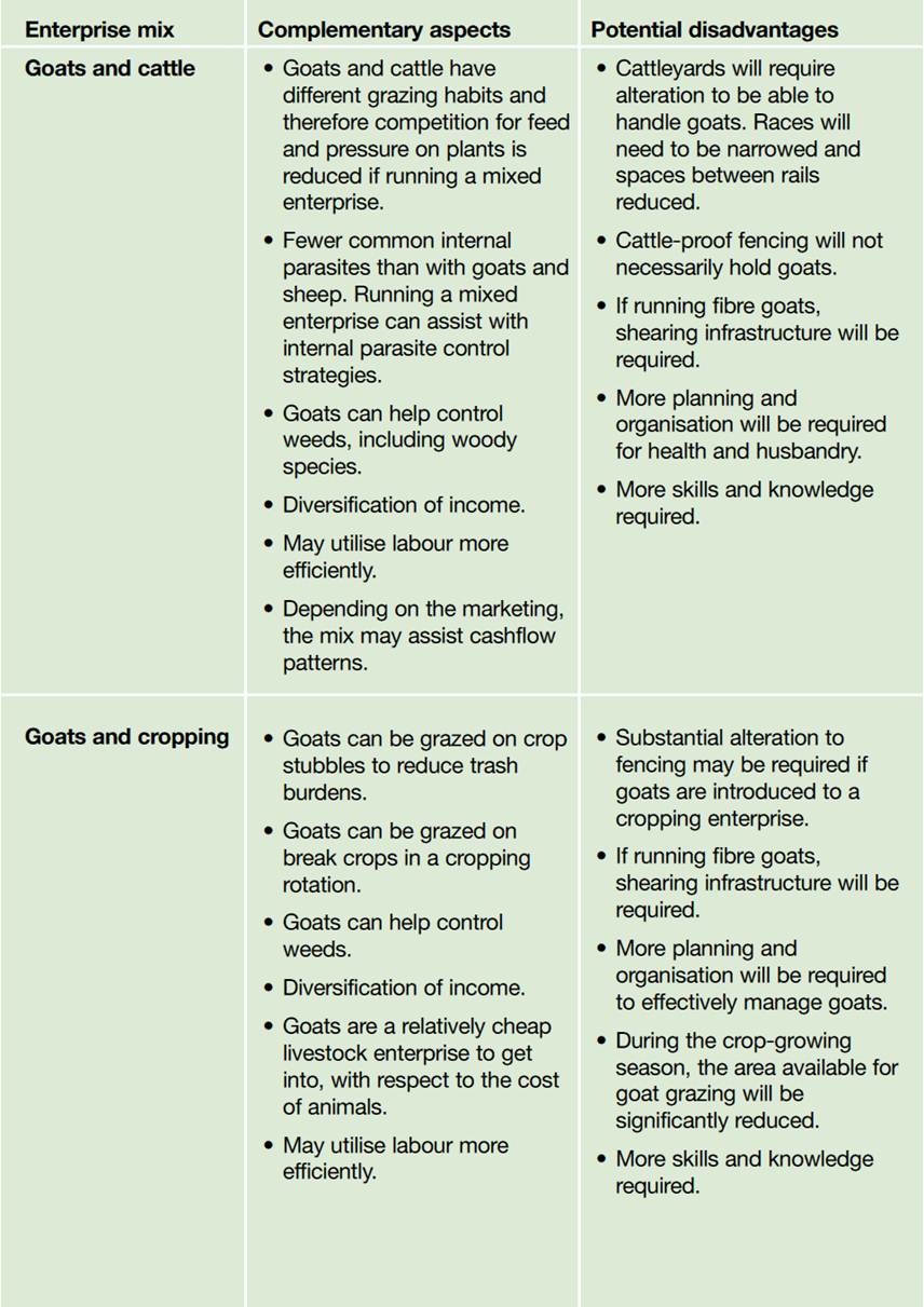 If you are considering incorporating a goat enterprise into an existing farming business, the following table provides some insights into how some of the more common enterprise mixes work in a practical sense.