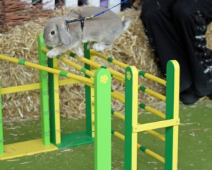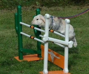 Rabbit show jumping (sometimes known as rabbit dressage or rabbit hopping) is a competition in which trained domestic rabbits leap over appropriately sized obstacles. The activity began in the late 1970s in Sweden (where it is known as Kaninhop). It was popularized in the United Kingdom following an appearance on the TV show That’s Life!. There are more than fifty rabbit show jumping clubs throughout Scandinavia.