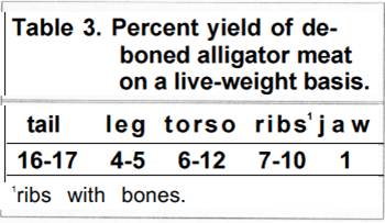 Specific state laws regulate the size of meat cartons (e.g., not larger than 5 pounds), labelling of the cartons with the names of the seller and buyer, date of sale, and tag number that corresponds to the hide. Average deboned dressout percentages for alligators in the 4- to 6-foot range are given in Table 3.