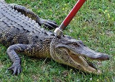 Alligators can be aggressive, particularly if under stress. Therefore, handling alligators must be done with care and with the proper equipment. Handlers should always wear heavy leather boots and gloves. Catch sticks or nooses should be used to get animals under control.