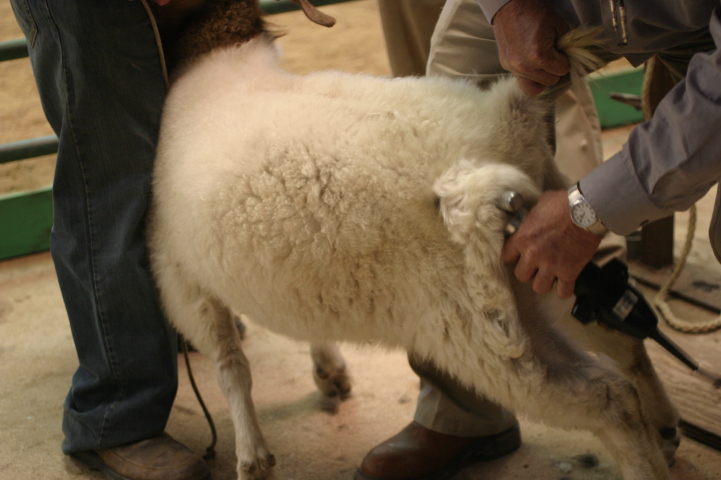 8 ) step back, starting the goat’s head back between the legs and finish off with 2 blows on the last leg. Blows on the last side must be made against the lie of the fibre (contrary to the system with sheep) as the comb may ride over the fleece.