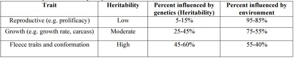 Traits are not equally affected by the animal’s genetics. The heritability of a trait is a measure of the relative importance of genetics and environment in developing the phenotype. Table 1 list a few examples of traits and their heritability. The genetic contribution to the phenotype of a trait with a low heritability is only~10%, whereas with highly heritable traits genetics may account for approximately half of the final phenotypic result. Since the heritability of all these traits is greater than zero, selection will result in genetic improvement for that trait. However, improvement will be much faster (occur in fewer generations) for traits with high heritabilities.