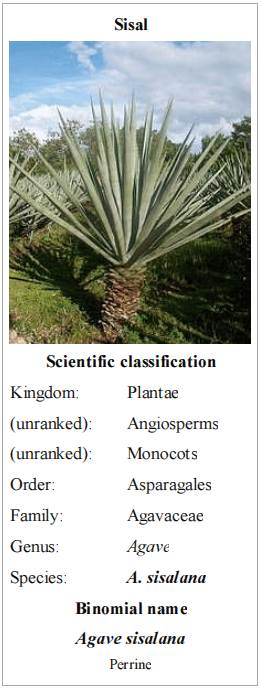 Sisal (Agave sisalana) is an agave that yields a stiff fibre traditionally used in making twine, rope and also dartboards. The term may refer either to the plant or the fibre, depending on context. It is sometimes incorrectly referred to as sisal hemp because hemp was for centuries a major source for fibre, so other fibres were sometimes named after it.