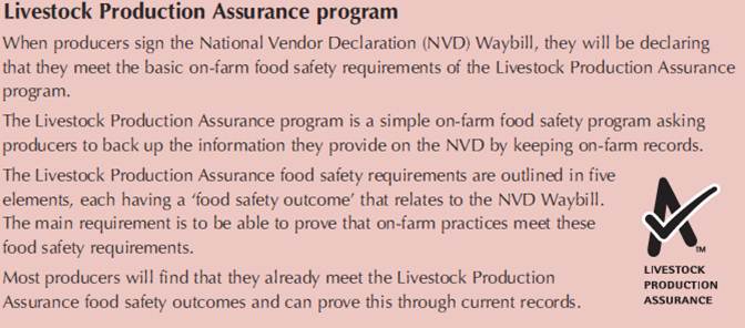 MLA has developed a Livestock Production Assurance program based on the cattle National Vendor Declaration (NVD) Waybill. This is a key tool underpinning Australia’s food safety reputation for cattle. Producers use the NVD to declare valuable information about the food safety status of cattle being sold. An example of the NVD Waybill for cattle, and instructions on how to fill in the sections, are provided in National Vendor Declaration (NVD) Waybill for cattle.