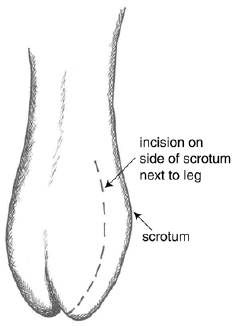 b) If you are right handed, use your left hand to force one testicle to the bottom outside of the scrotum. Once the testicle is in the proper site, hold it there and use a scalpel to make a generous incision over the testicle. The incision may extend into the testicle itself.