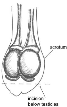 a) Make the incisions on the outside of the lower half of each side of the scrotum (Figure 2).