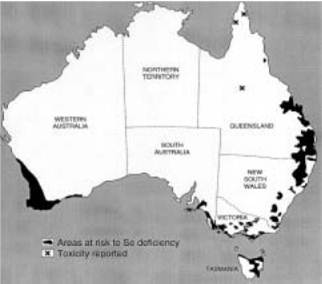 This map highlights the main regions where trace element deficiencies occur (but does not necessarily cover all trace element deficient regions).
