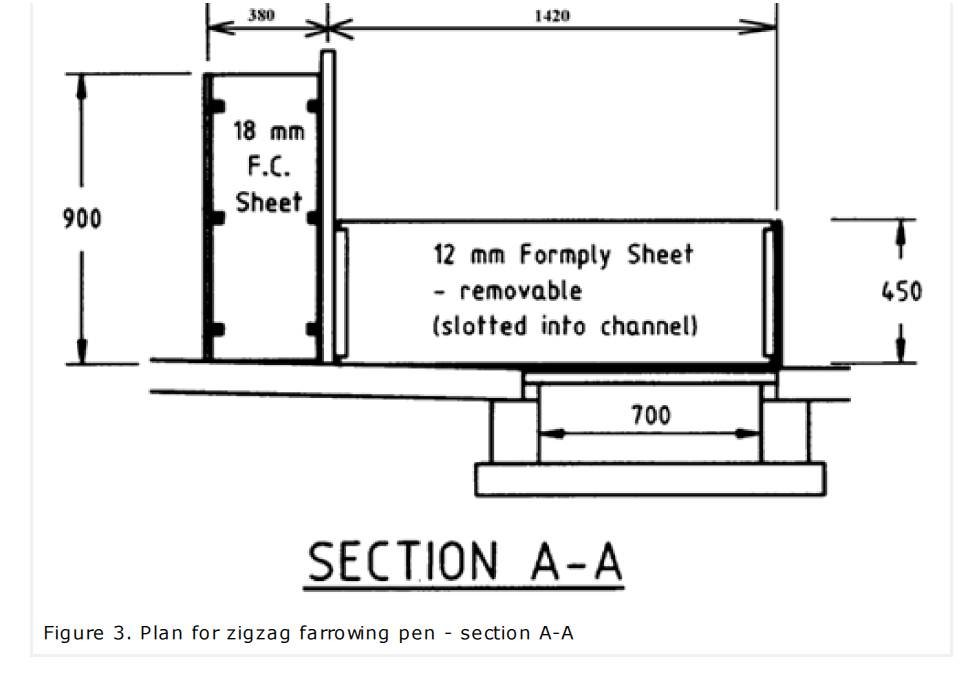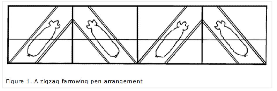 Pig farrowing crates arranged in a zigzag pattern in pens on floors that are part-concrete and part-slatted can give excellent results. Zigzag farrowing pens offer several advantages, including that: