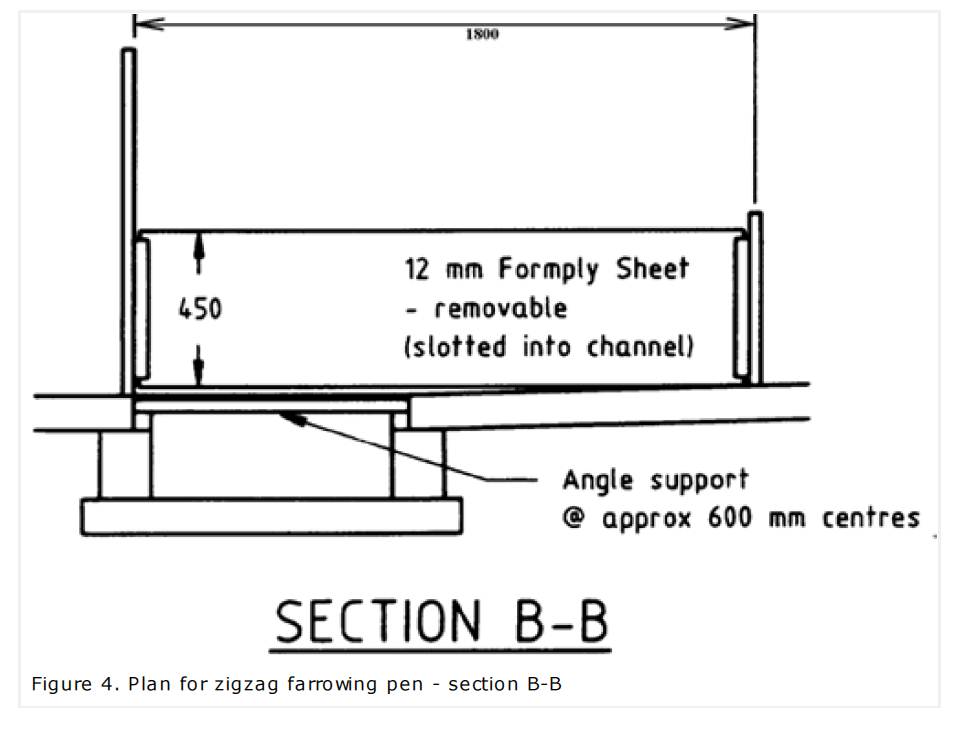 The pen sides and the removable front may be 450 mm high if four-week weaning and/or litter mixing is practised there. Otherwise, divisions may be up to 600 mm high. The fixed side and front enclosing the sow must be at least 900 mm high.