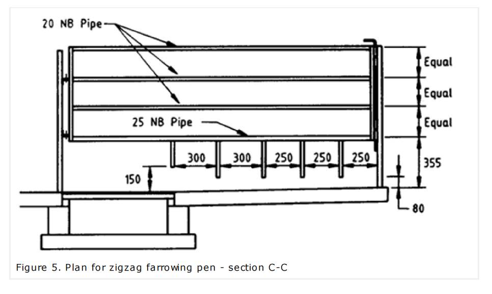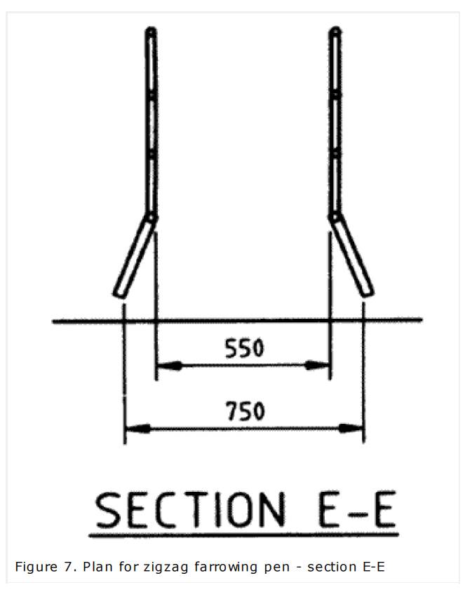 One hurdle is fixed and the other is hinged at the back wall to enable the introduction or removal of the sow. Both hurdles should be removable, making the pen easier to clean between litters. The bottom rail may be either fixed (expanded) or adjustable. If the height of the lower rails is adjustable, it should be possible to adjust to between 165 and 215 mm from the floor. This can be done with yokes and bolts, and pipe clamps, or by altering the height of the entire hurdle at the hinges. If the bottom rail is fixed, as an expanded rail, it should be at the same height and distance apart from the rail above, and the same distance from the opposite bottom rail as the prongs shown in Figure 7. The expanded bottom rail directly substitutes for the prongs and is easier to clean.