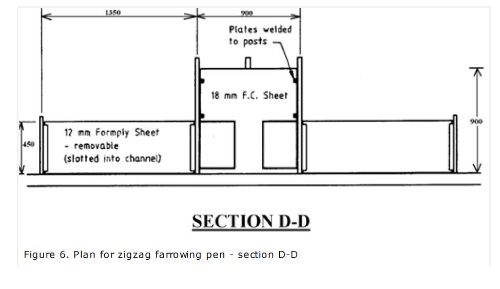 Fully compressed fibre cement sheeting is suitable for removable pen divisions (as shown in Figures 2 to 7). Other materials, such as plywood or sawn timber, can also be used. Polypropylene and recycled plastic boards perform well as they are warm and easy to clean. The pen front should be removable to permit pigs to enter or exit as required. It can be dropped into vertical guides or pinned at both ends.